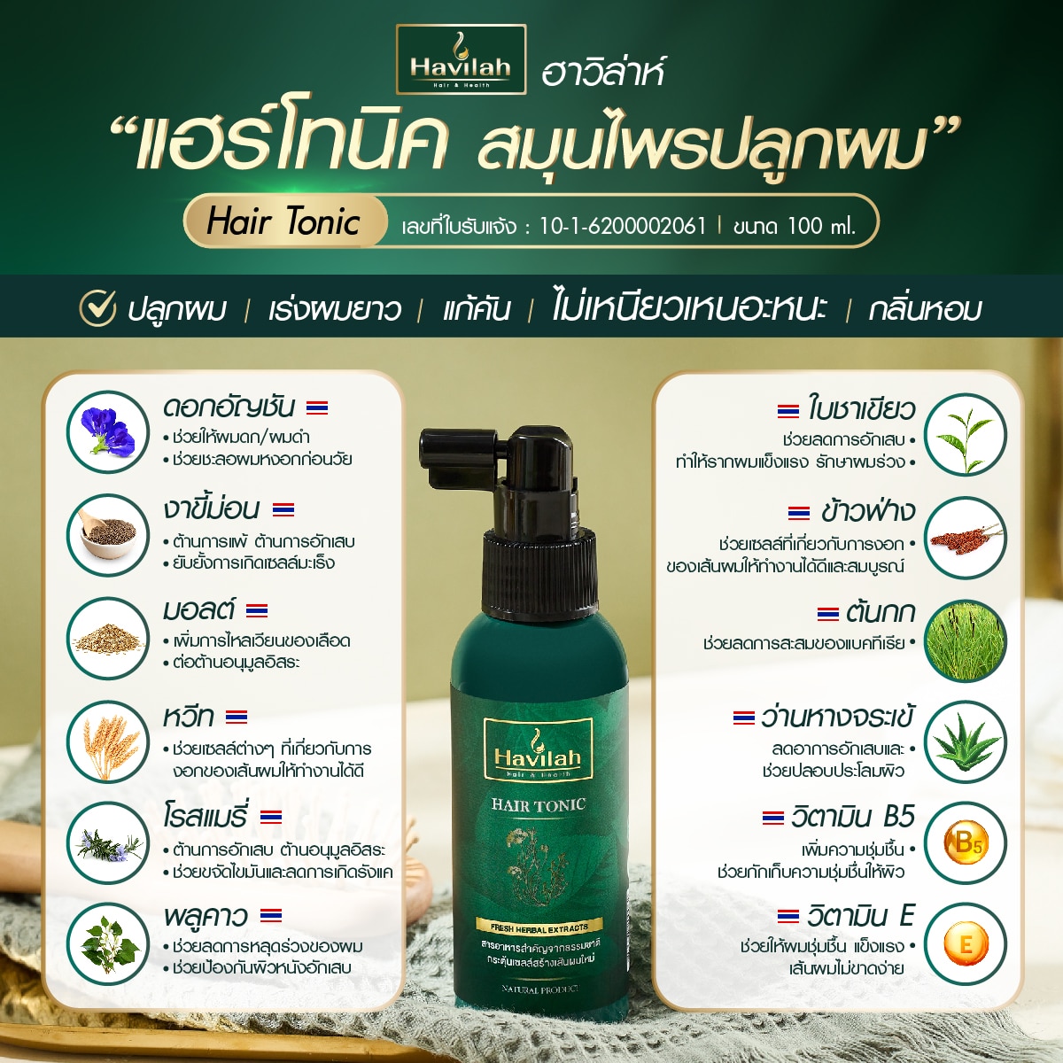 ฮาวิล่าห์ แฮร์โทนิค เป็นสารอาหารจากสมุนไพรที่เส้นผมต้องการ ช่วยให้หนังศีรษะสะอาด พร้อมให้คุณค่าจากดอกอัญชัน และวิตามินต่างๆ ที่เป็นสารอาหารที่เส้นผมต้องการ ฮาวิล่าห์ แฮร์โทนิค ช่วยกระตุ้นให้รากผมทำงาน เส้นผมจึงเกิดใหม่อย่างแข็งแรงไม่หลุดร่วงง่าย